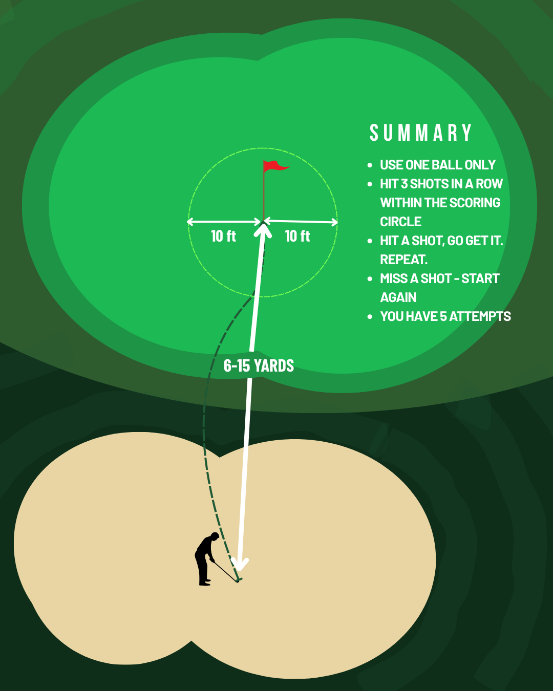 Simulate real on-course pressure by requiring conversion inside a realistic scoring zone.